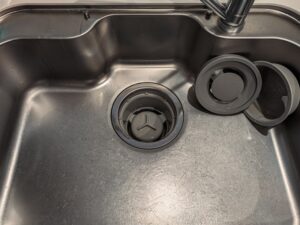 週次メンテナンスでは、排水口の徹底掃除を行います。 排水口のパーツを取り外し、アルカリ電解水と歯ブラシで細部まで清掃します。 また、シンク全体を研磨剤を使わないクリーナーで磨き、輝きを保ちます。